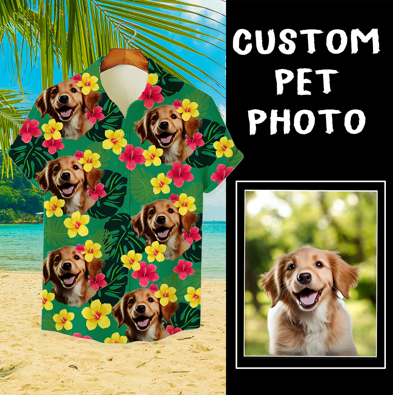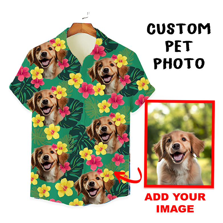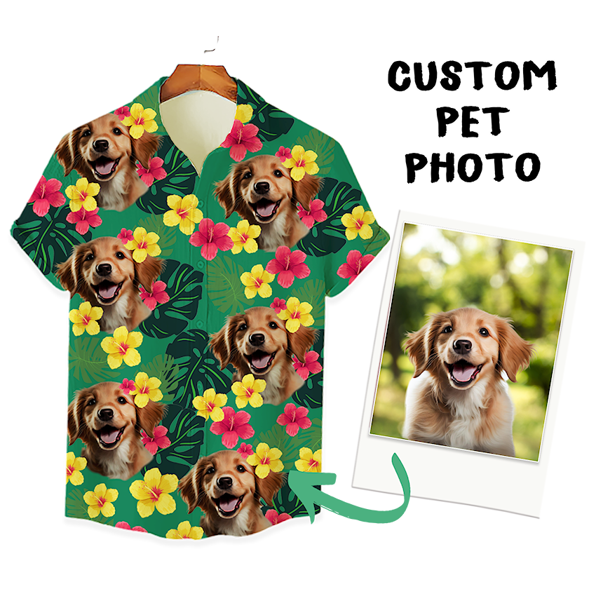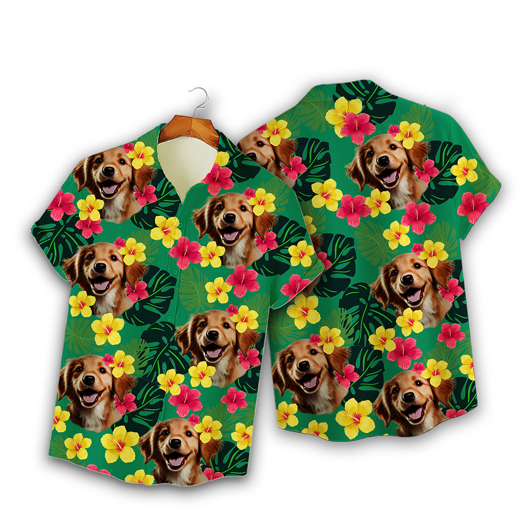 Custom Hawaiian Shirt for Pet Lovers | Personalized Pet Lovers Gift | Tropical Hibiscus & Leaves Pattern Green Color Aloha Shirt