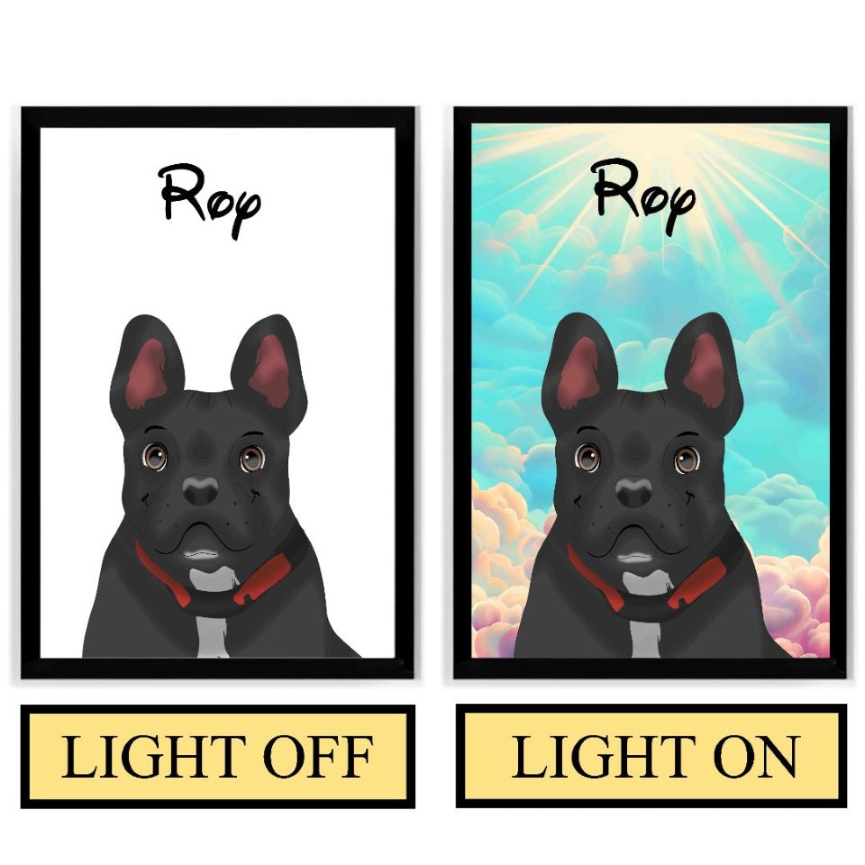 Bring your pet's spirit to life with our Glowing Keepsake Custom LED PhotoFrame, featuring a special glowing effect that adds depth and realism to your artwork. When you turn on the light, the background and your pet’s portrait come to life, creating a mesmerizing glow that enhances every detail. Choose from a variety of stunning backgrounds to make this tribute uniquely yours.