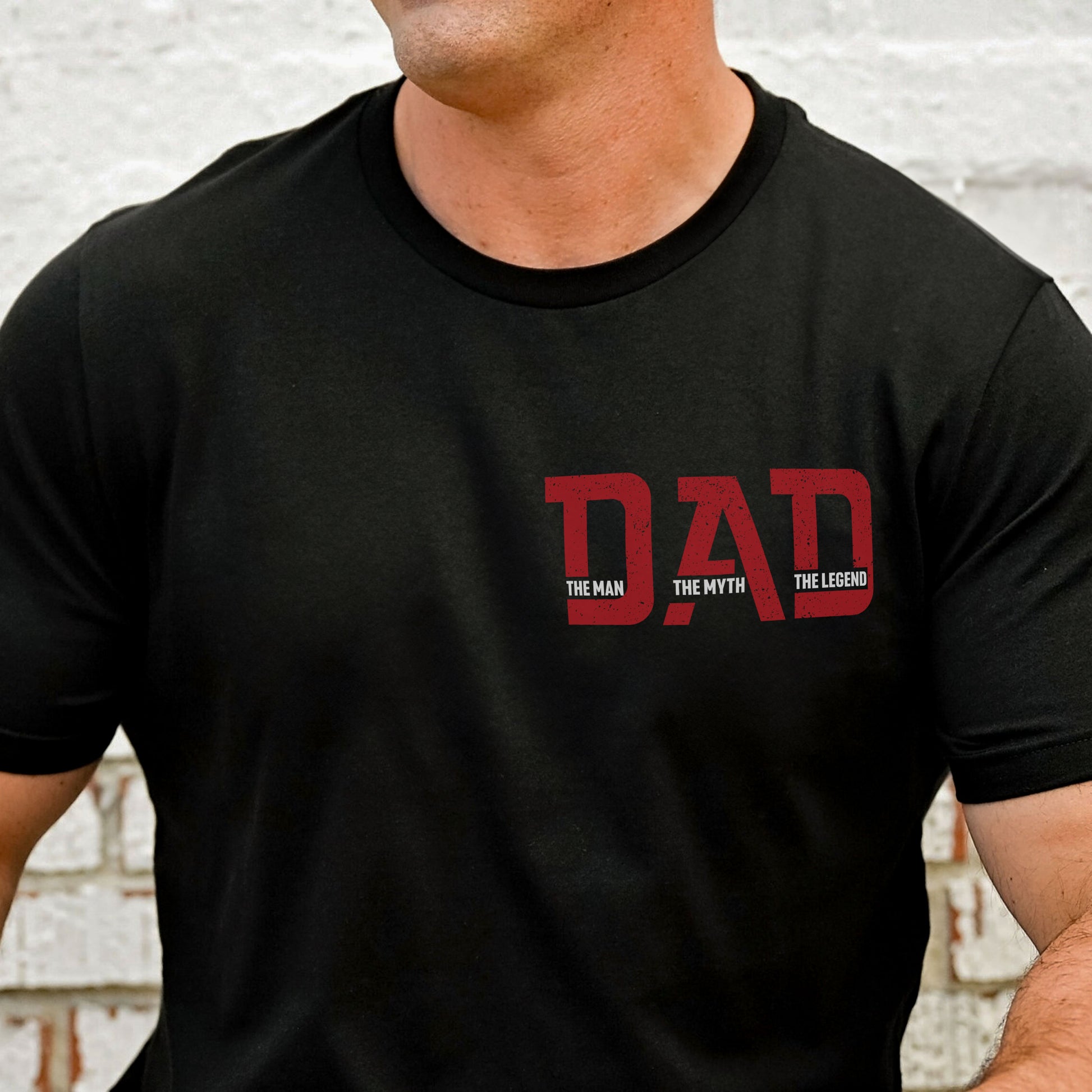 Honor the incredible man in your life with our The Man The Myth The Legend Personalized T-Shirt. This unique apparel features a bold statement on the front and a special personalized design on the back, showcasing a dad and kids' fist bump along with their nicknames. Perfect for Father’s Day, birthdays, or any special occasion, this t-shirt is a tribute to the man who plays so many important roles.
