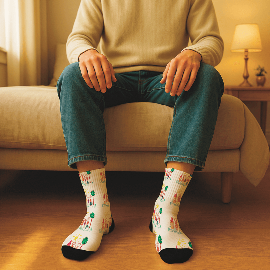 Custom Face or Doodle Design: Share a photo or your own doodle, and our expert designers will transform it into a fun and detailed graphic on the socks.