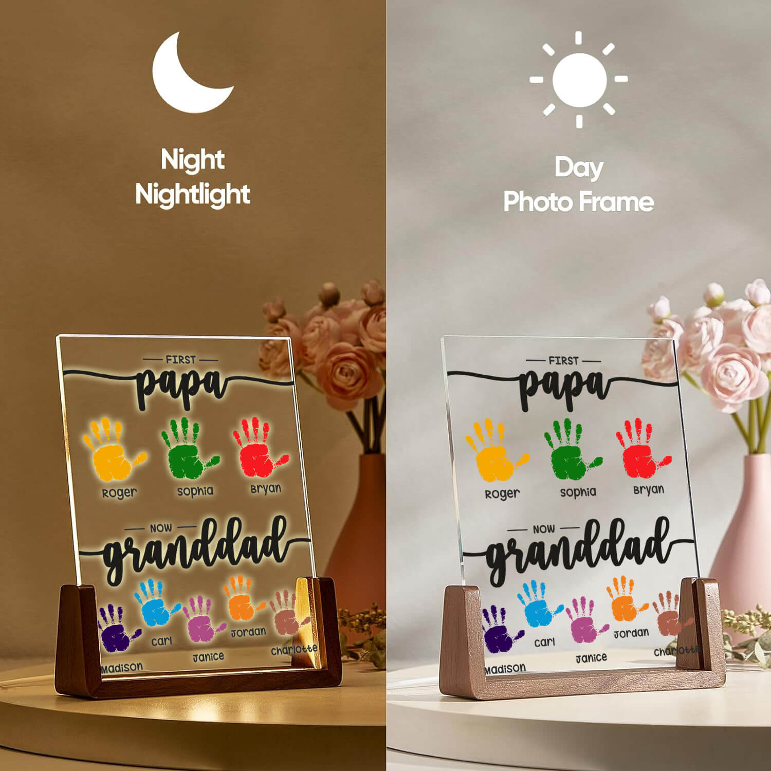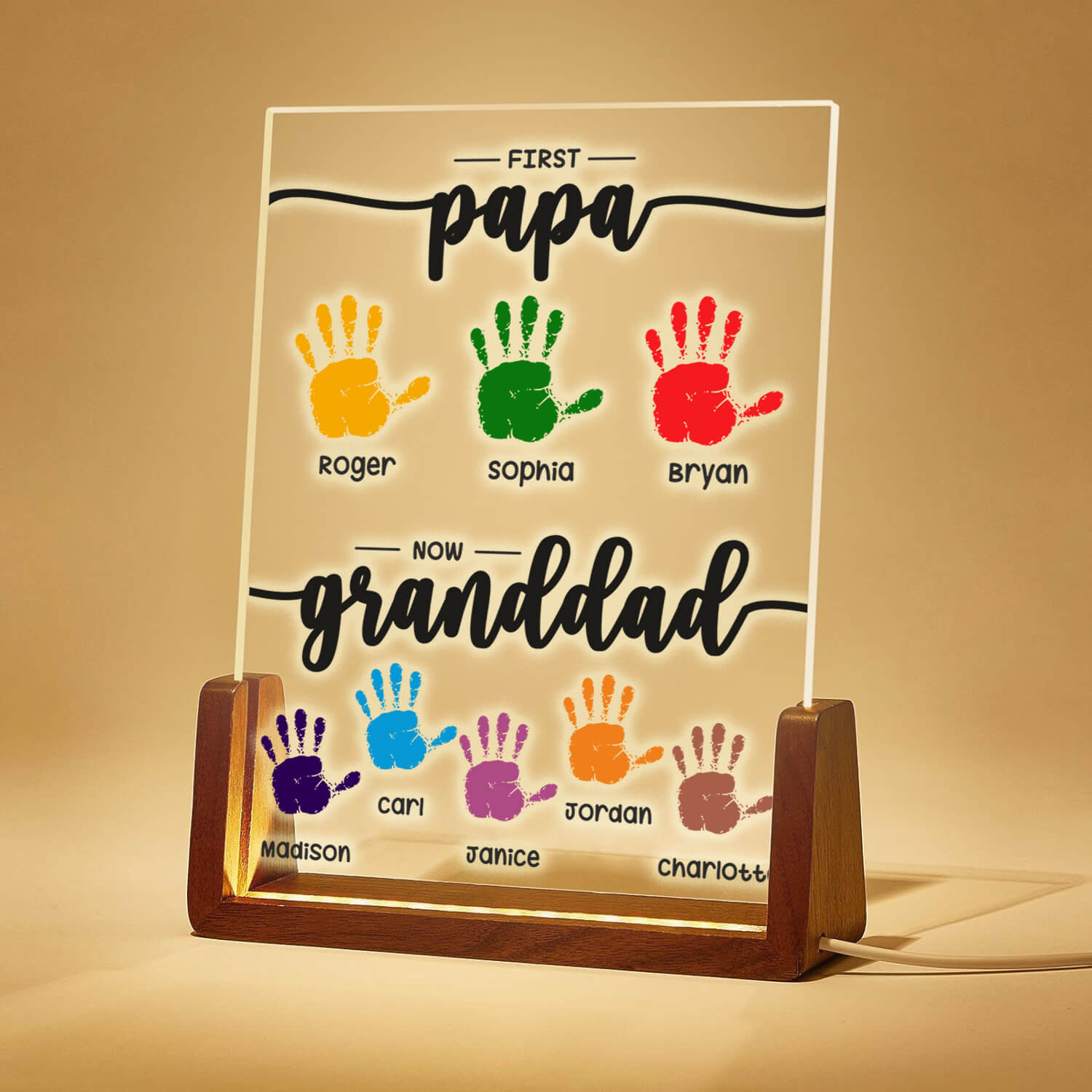 Celebrate the special bond between generations with our Personalize Daddy First, Granddad Later LED Acrylic Plaque. This heartfelt tribute beautifully captures the joy of fatherhood and the legacy of grandparenthood. The soft LED light adds a warm glow, symbolizing the love that transcends time. Personalize it with names for a truly unique touch. It's not just a plaque; it's a cherished keepsake that honors the enduring love of family.