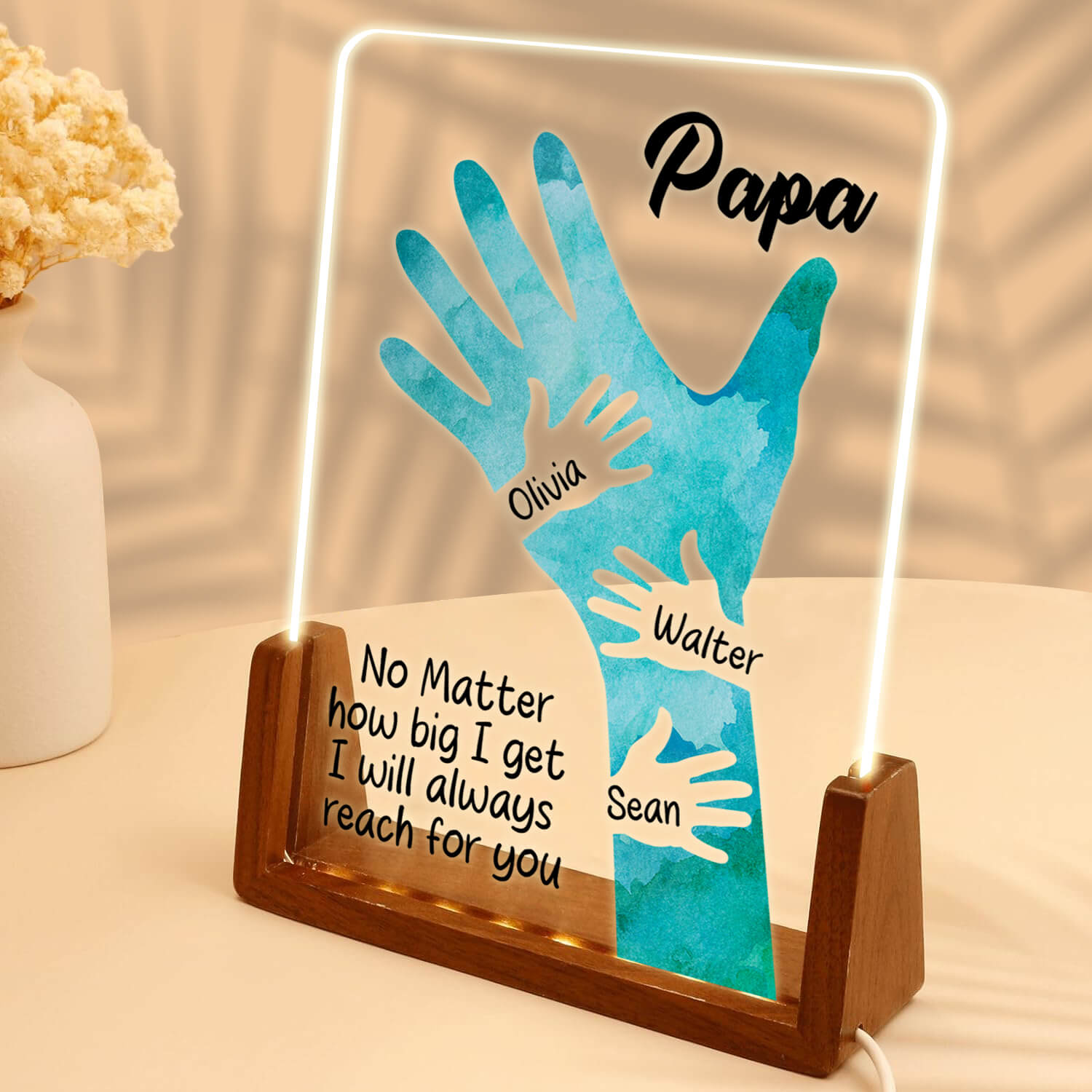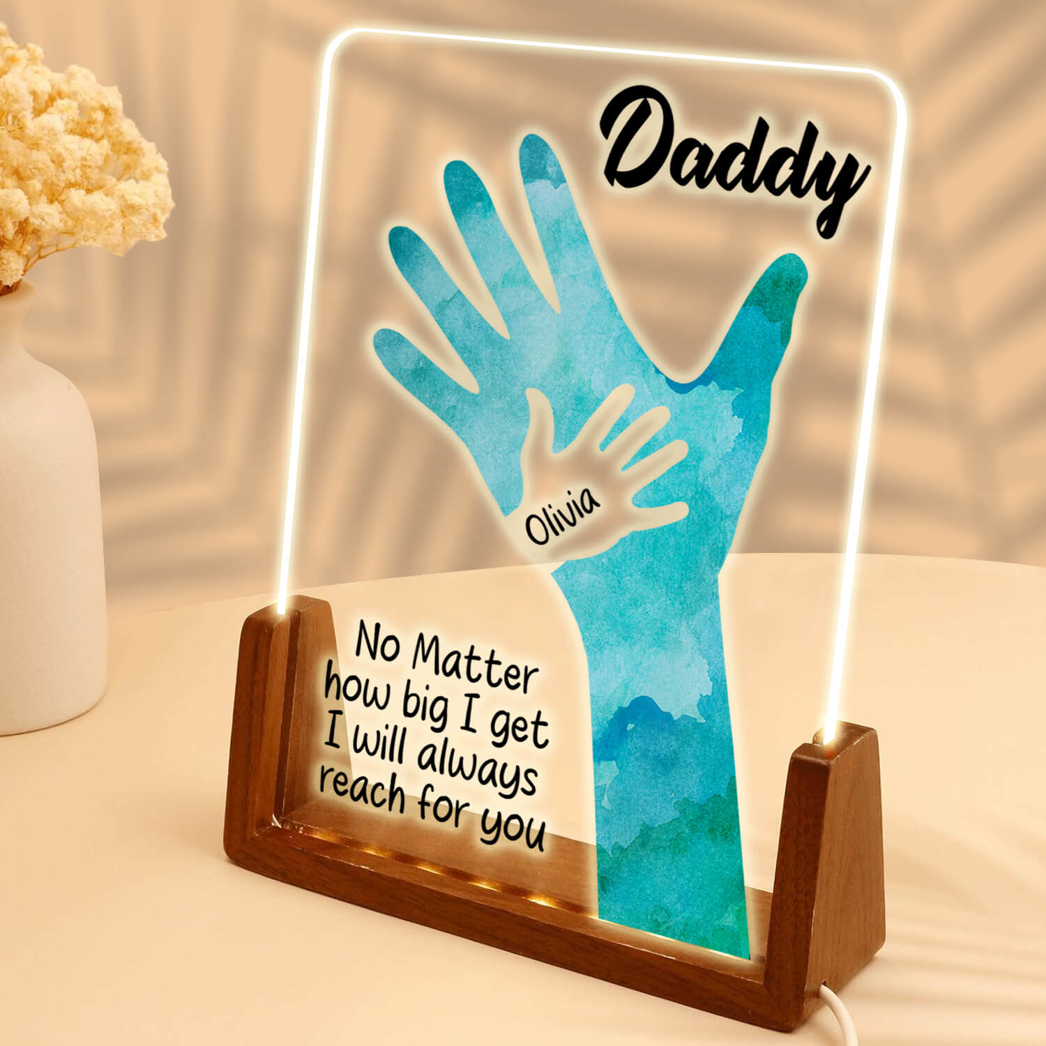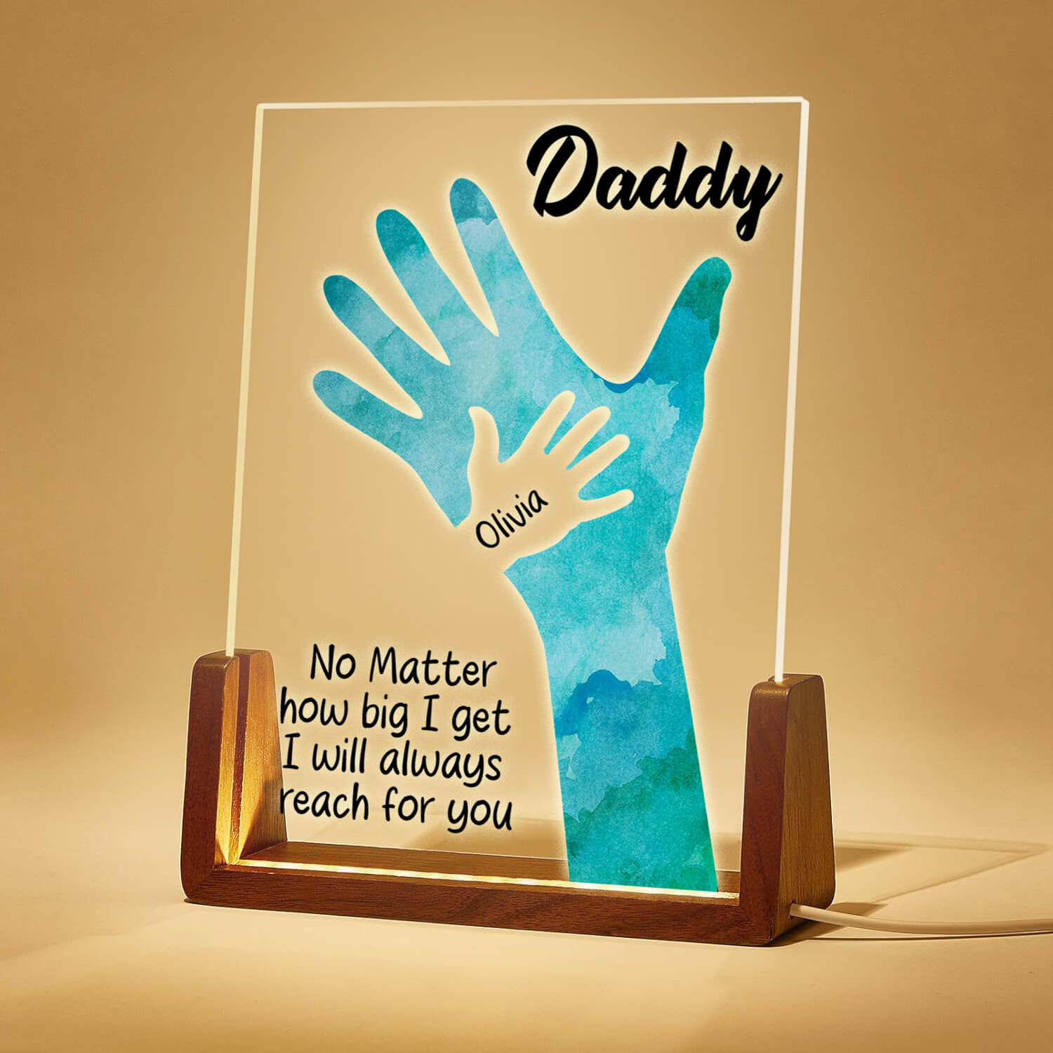 Illuminate your father's memory with our Personalize Father Forever LED Acrylic Plaque. Crafted with precision and care, this plaque radiates a soft, comforting glow, symbolizing the enduring love between a father and child. Personalize it with your children's name for a truly heartfelt tribute. It's not just a plaque; it's a lasting reminder of the quality bond you shared. Honour his legacy with this exquisite piece, a beacon of love and quality craftsmanship.