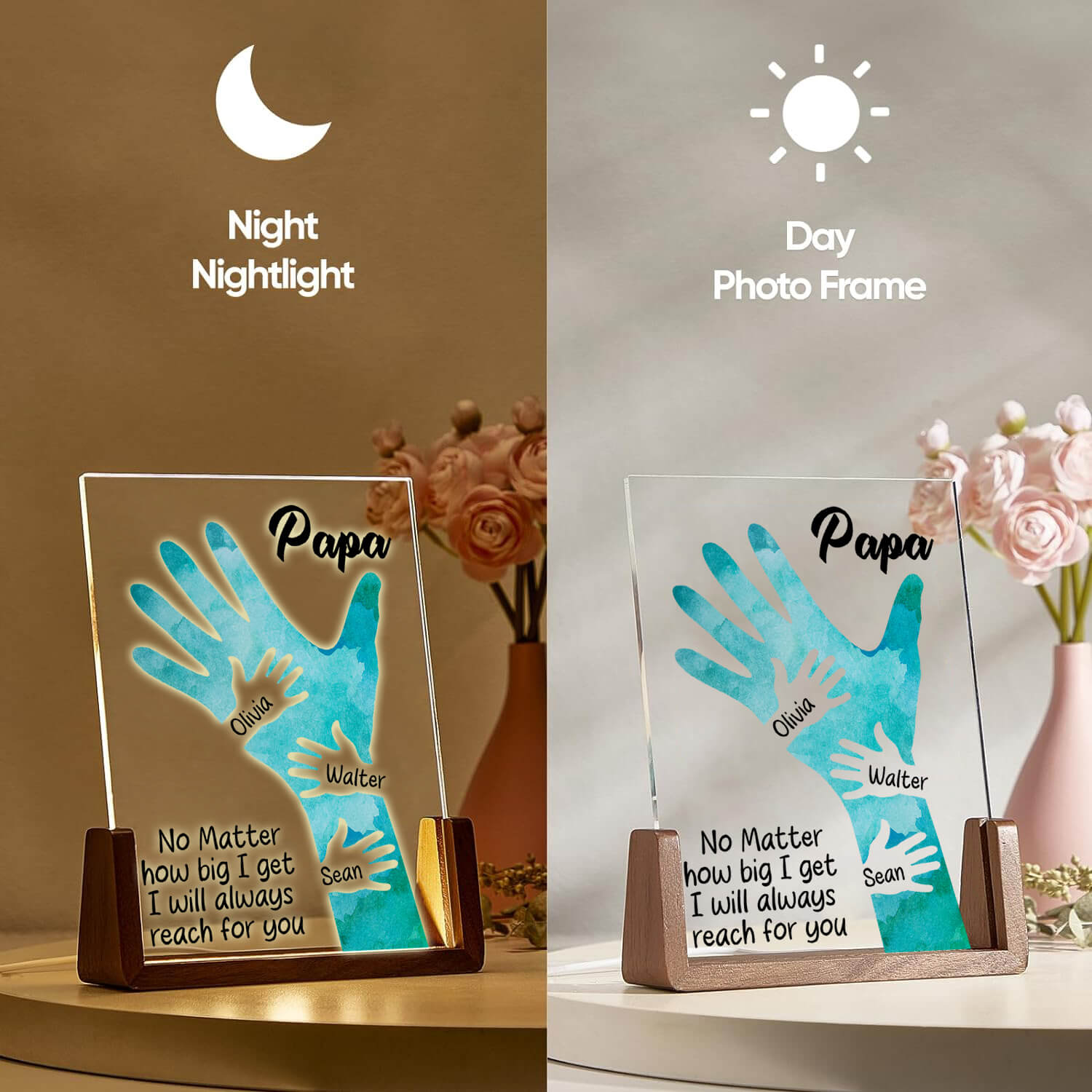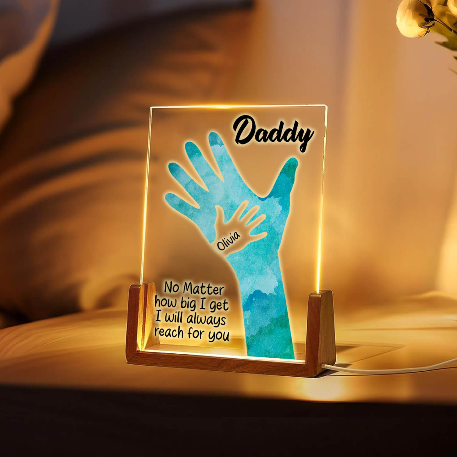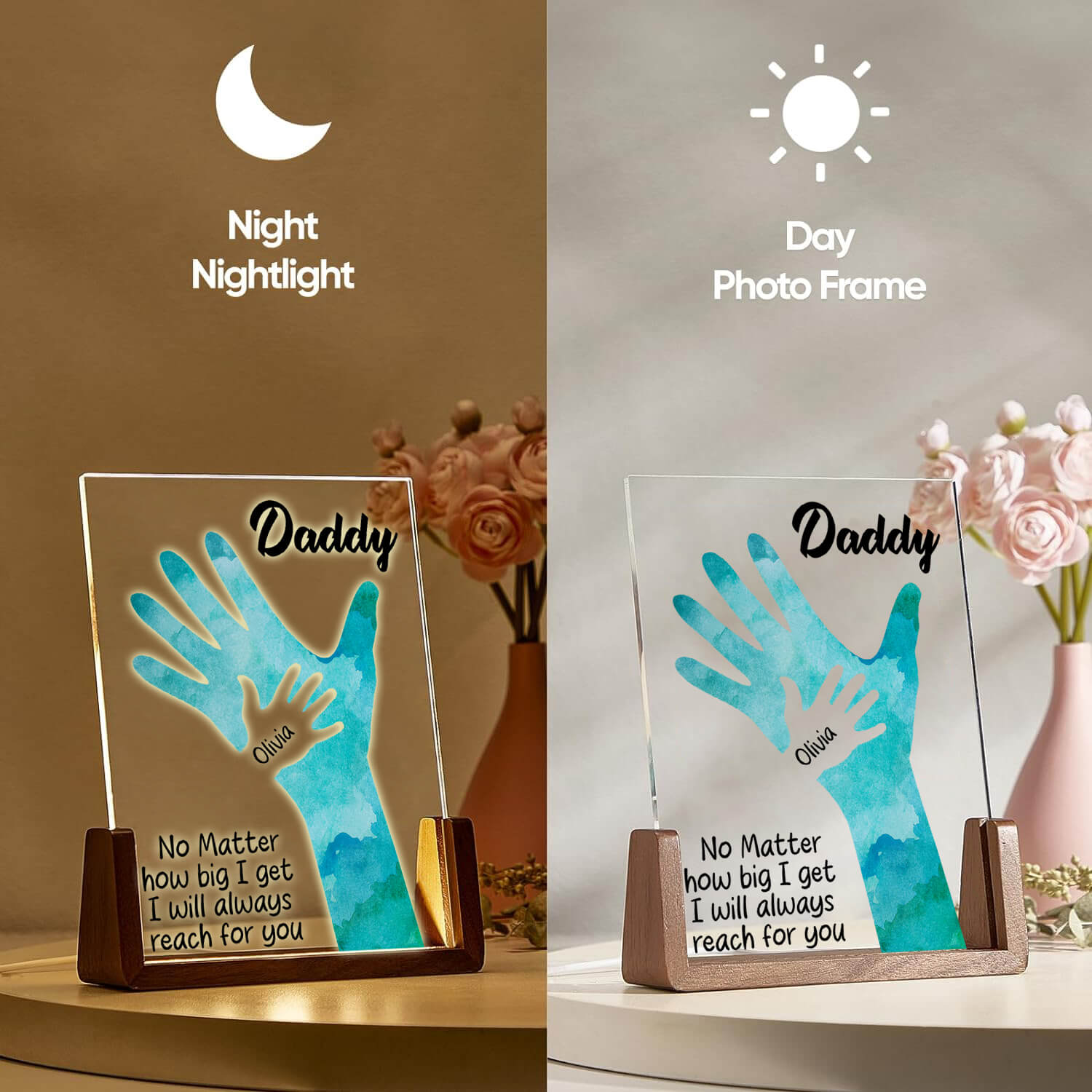 Illuminate your father's memory with our Personalize Father Forever LED Acrylic Plaque. Crafted with precision and care, this plaque radiates a soft, comforting glow, symbolizing the enduring love between a father and child. Personalize it with your children's name for a truly heartfelt tribute. It's not just a plaque; it's a lasting reminder of the quality bond you shared. Honour his legacy with this exquisite piece, a beacon of love and quality craftsmanship.