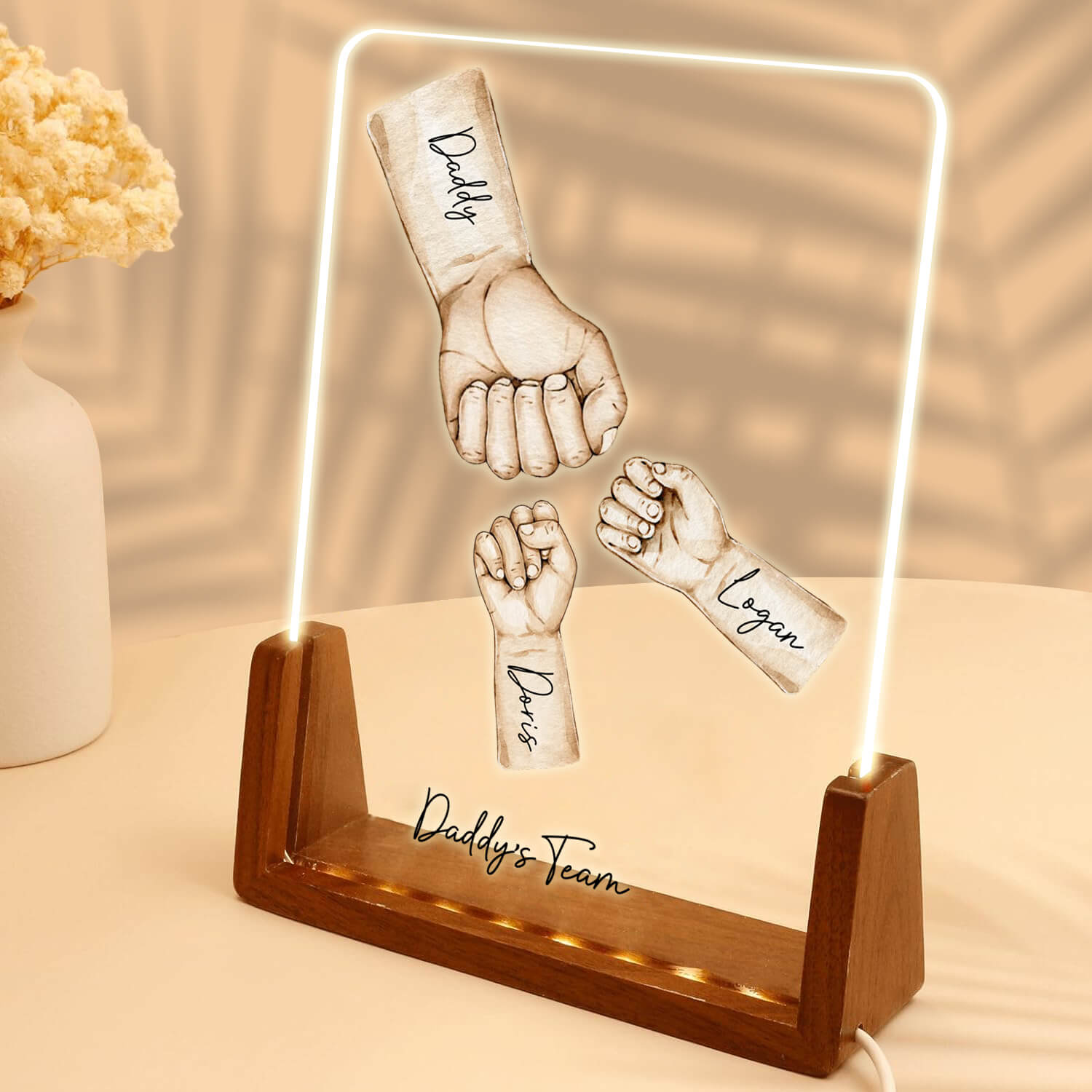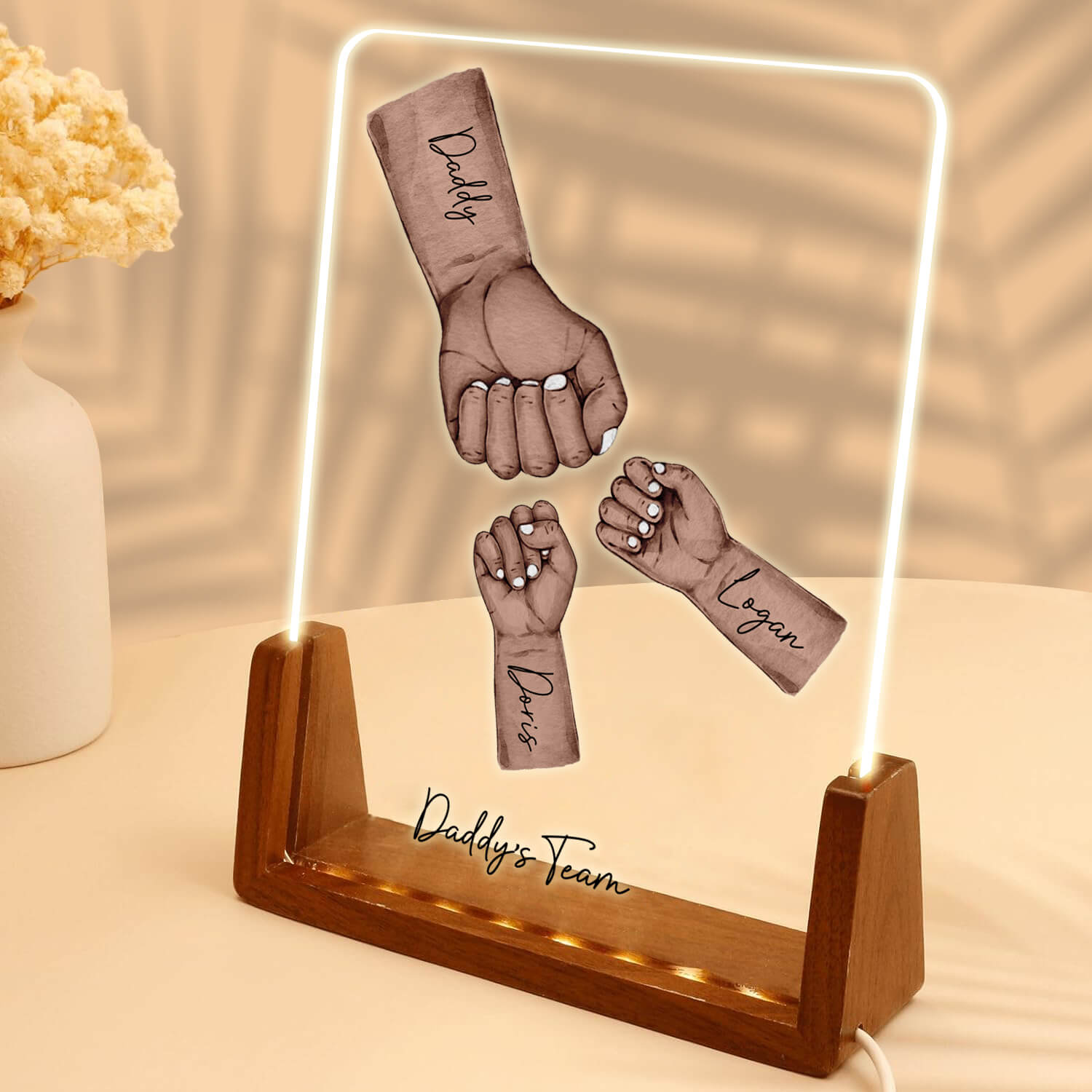 Introducing the Personalize Fist Bump LED Light Acrylic Plaque! Crafted from high-quality optical acrylic and set on a sturdy wooden base, this plaque combines durability with vibrant LED lighting. Perfect for celebrating friendship and special moments, it lights up any room with joy. Customize it with your names or a special title to create a unique and heartwarming gift that will make anyone smile.