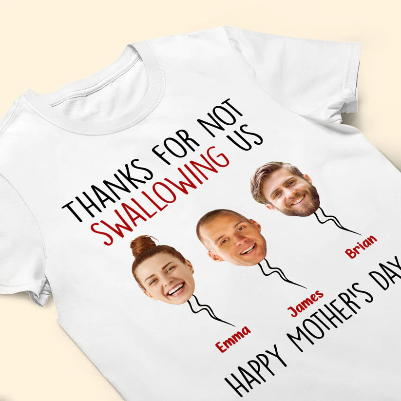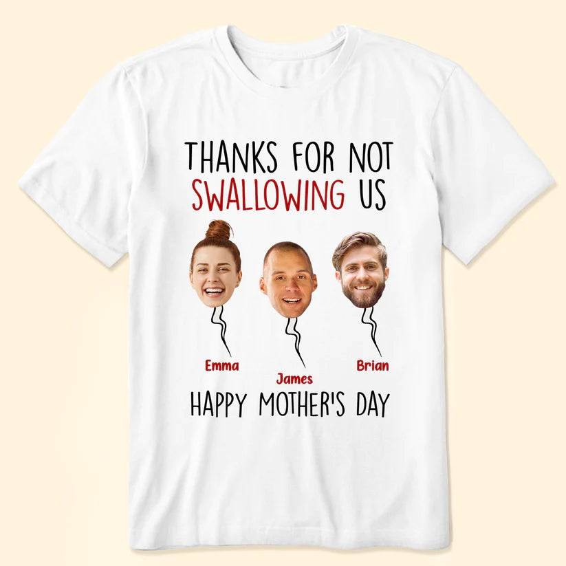 Show your mom your appreciation with a touch of humor with our Thanks For Not Swallowing Us Personalized Tee/Sweatshirt. This custom apparel features images of all her kids along with their names, making it a unique and heartfelt gift. Perfect for Mother's Day, birthdays, or any special occasion, this t-shirt or sweatshirt is a fun and loving tribute to your mom.