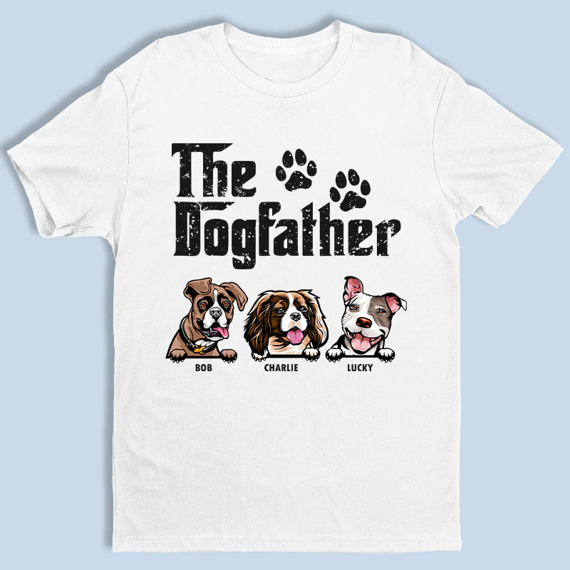 Celebrate the special bond between a dog parent and their furry friends with our The Dog Father Personalized Unisex T-Shirt. This custom apparel allows you to add images of your dogs along with their names, making it a unique and thoughtful gift for any dog dad or dog mom. Perfect for any occasion, this t-shirt is a loving tribute to the person who cherishes their dogs like family.