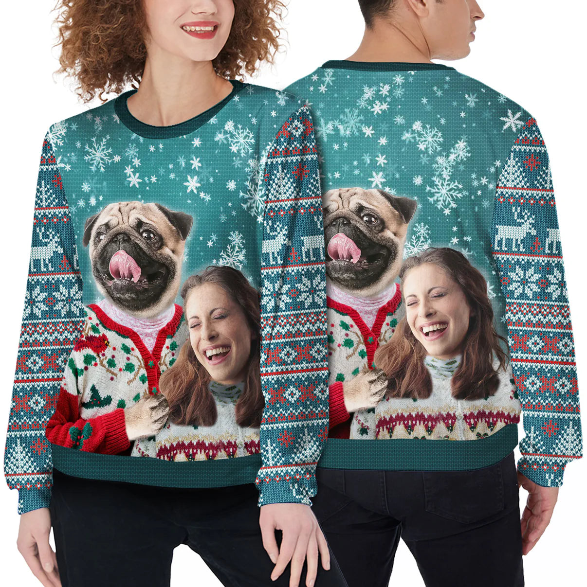 Celebrate the festive season with our Custom Ugly Sweater - Sky & Snowflakes. This personalized sweater allows you to add pictures of yourself and your pet, creating a unique and heartwarming holiday garment that's perfect for showcasing your special bond. Ideal for pet lovers, this ugly sweater combines the charm of a winter wonderland with a personal touch.