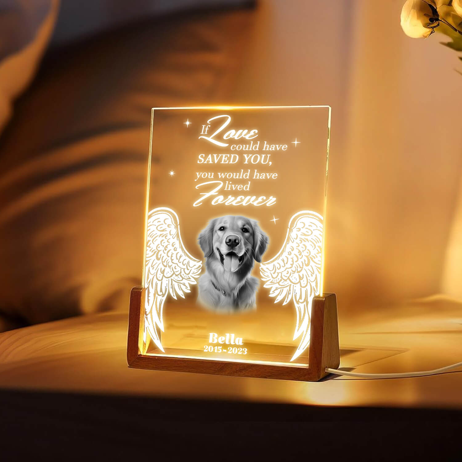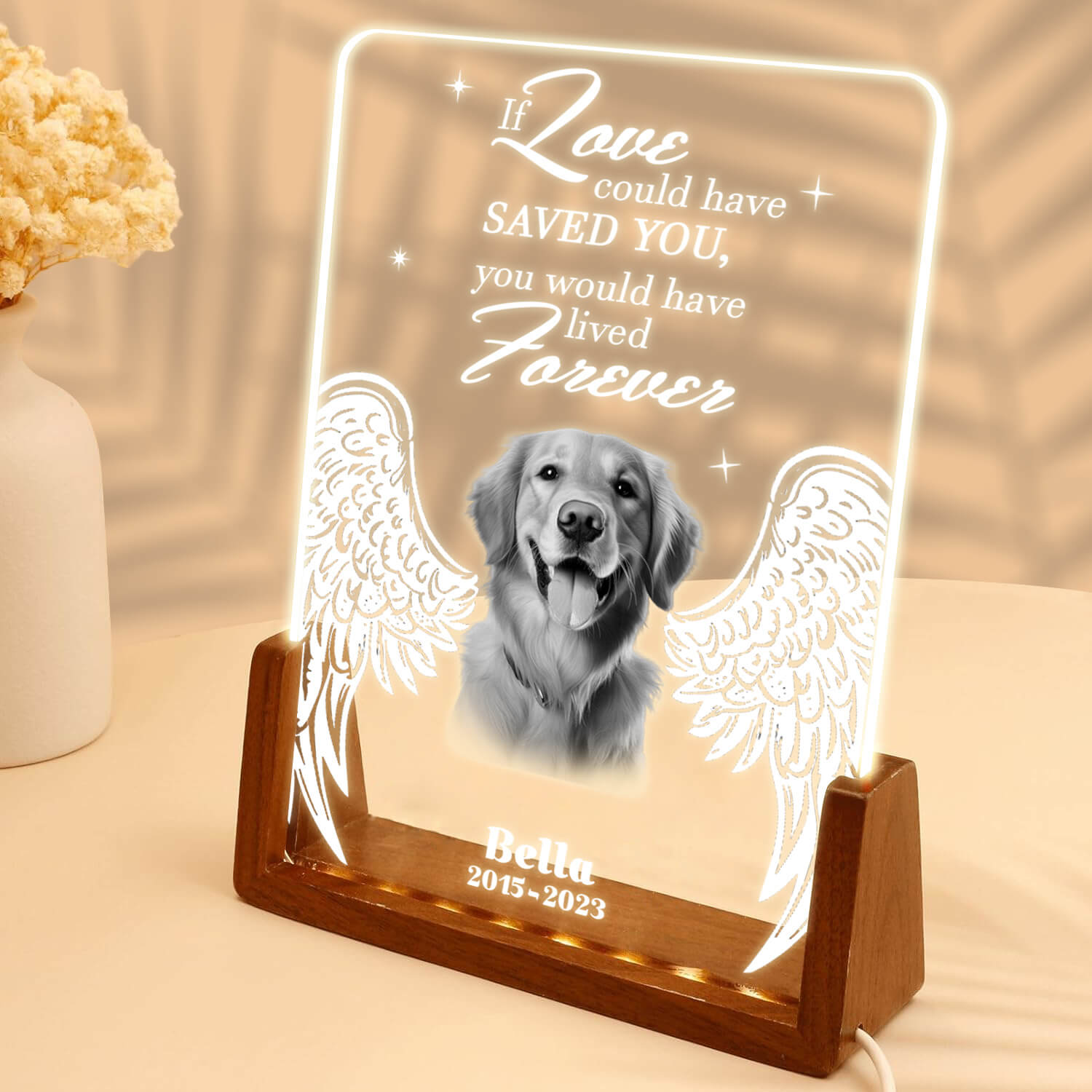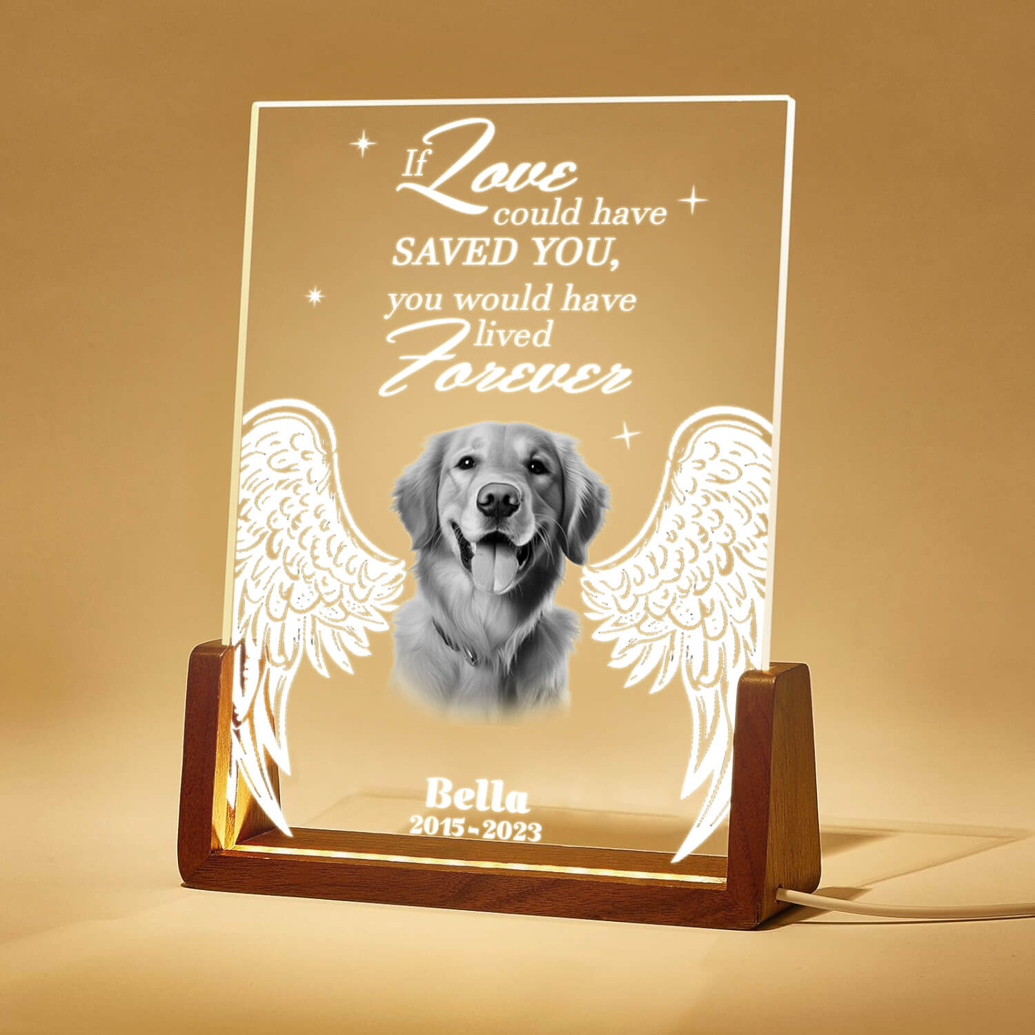 In loving memory of our dear furry friend who filled our hearts with love. Even though you're gone, your spirit lives on. Crafted from high-quality optical acrylic and set on a sturdy wooden base, this plaque combines durability with vibrant LED lighting. Perfect for remembering special moments, it lights up any room with joy. Customize it with your names or a special title to create a unique and heartwarming gift that will make anyone smile.