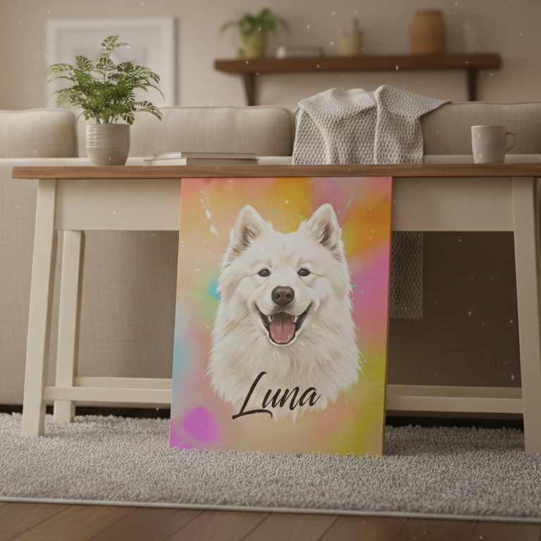 Select your canvas size and color, upload your pet photo, add optional text, and approve the preview. Your personalized pet artwork is created by real artists and prepared for printing.