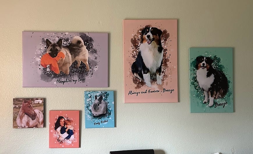 Select your canvas size and color, upload your pet photo, add optional text, and approve the preview. Your personalized pet artwork is created by real artists and prepared for printing.