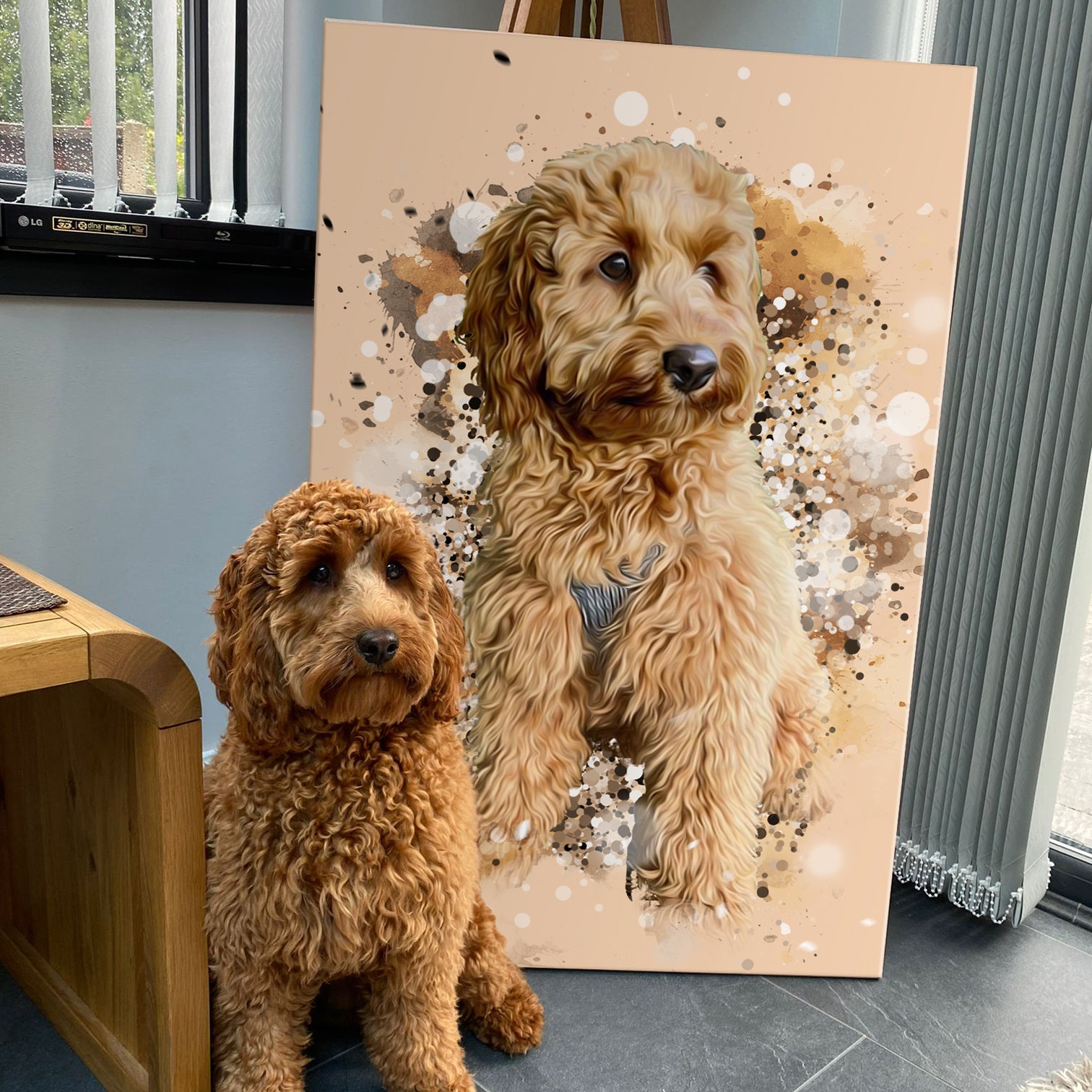 small breed dog sitting in front of a personalized portrait of itself